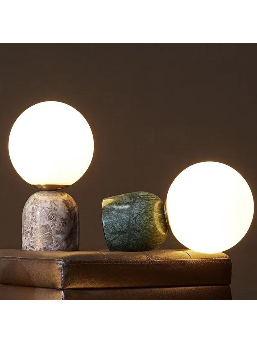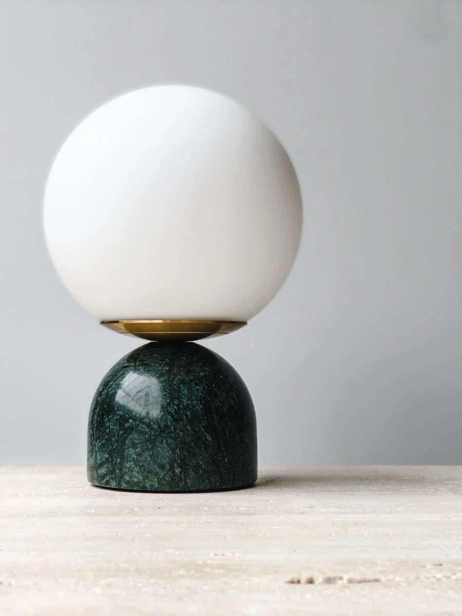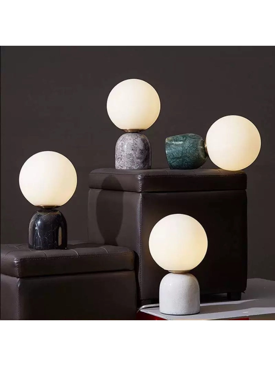 This elegant marble globe lamp combines solid natural stone with a sculptural silhouette for refined presence and ambient glow. Each base is hand carved from unique veined marble, paired with a soft milk glass dome to diffuse warm light. Compact yet striking, this lamp delivers tactile sophistication and quiet luxury to your bedside, shelf, or reading nook.