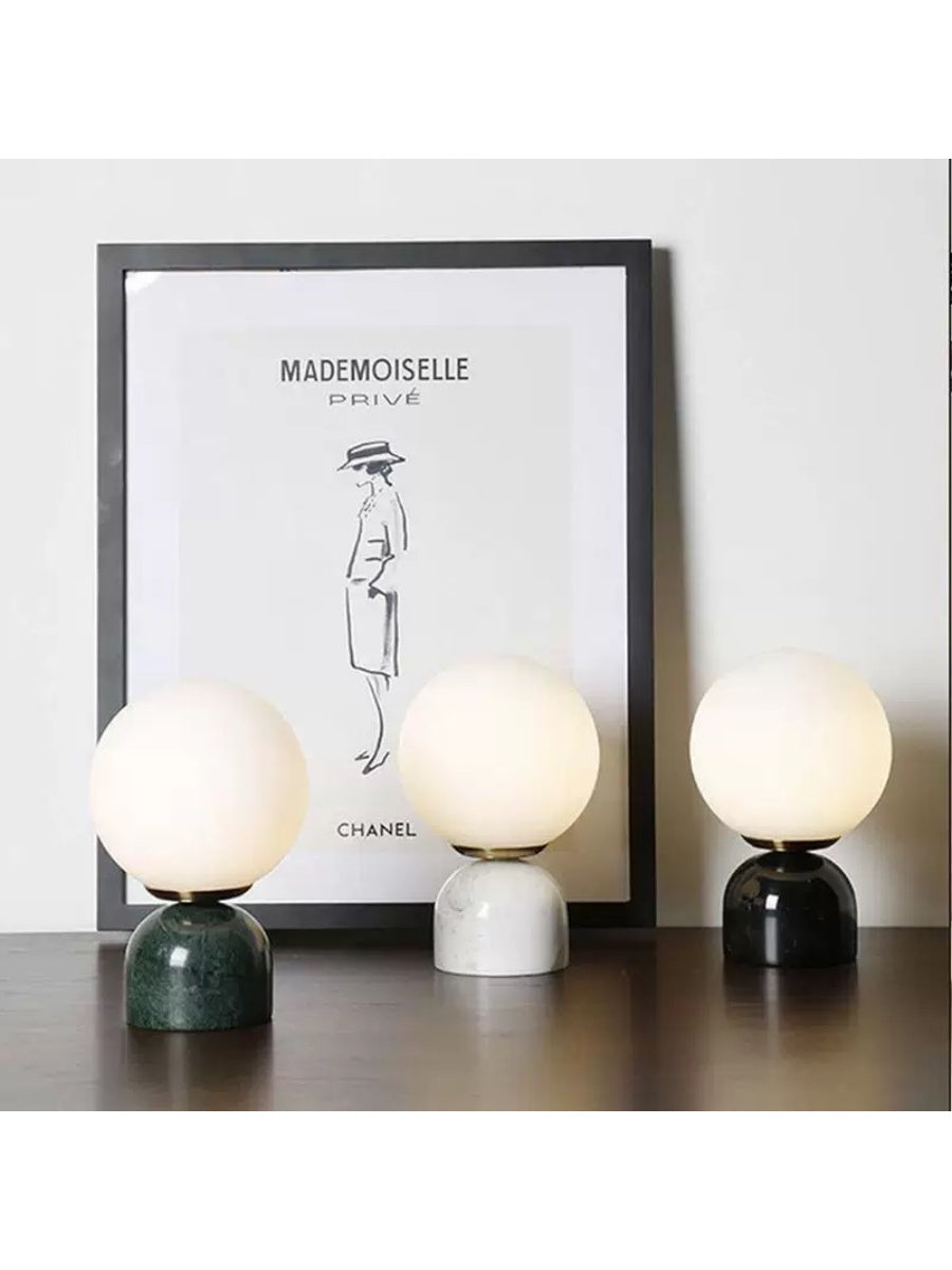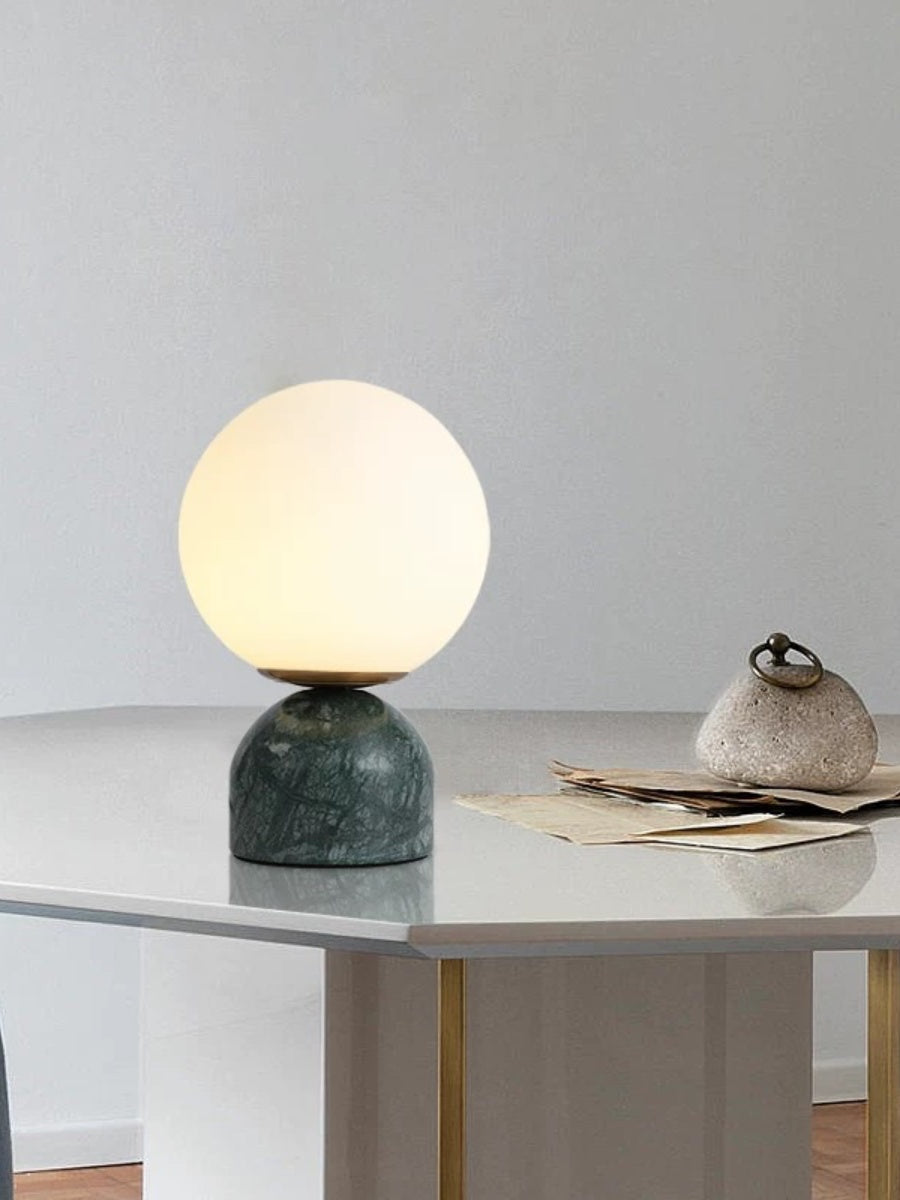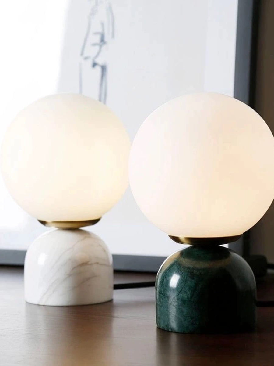 This elegant marble globe lamp combines solid natural stone with a sculptural silhouette for refined presence and ambient glow. Each base is hand carved from unique veined marble, paired with a soft milk glass dome to diffuse warm light. Compact yet striking, this lamp delivers tactile sophistication and quiet luxury to your bedside, shelf, or reading nook.